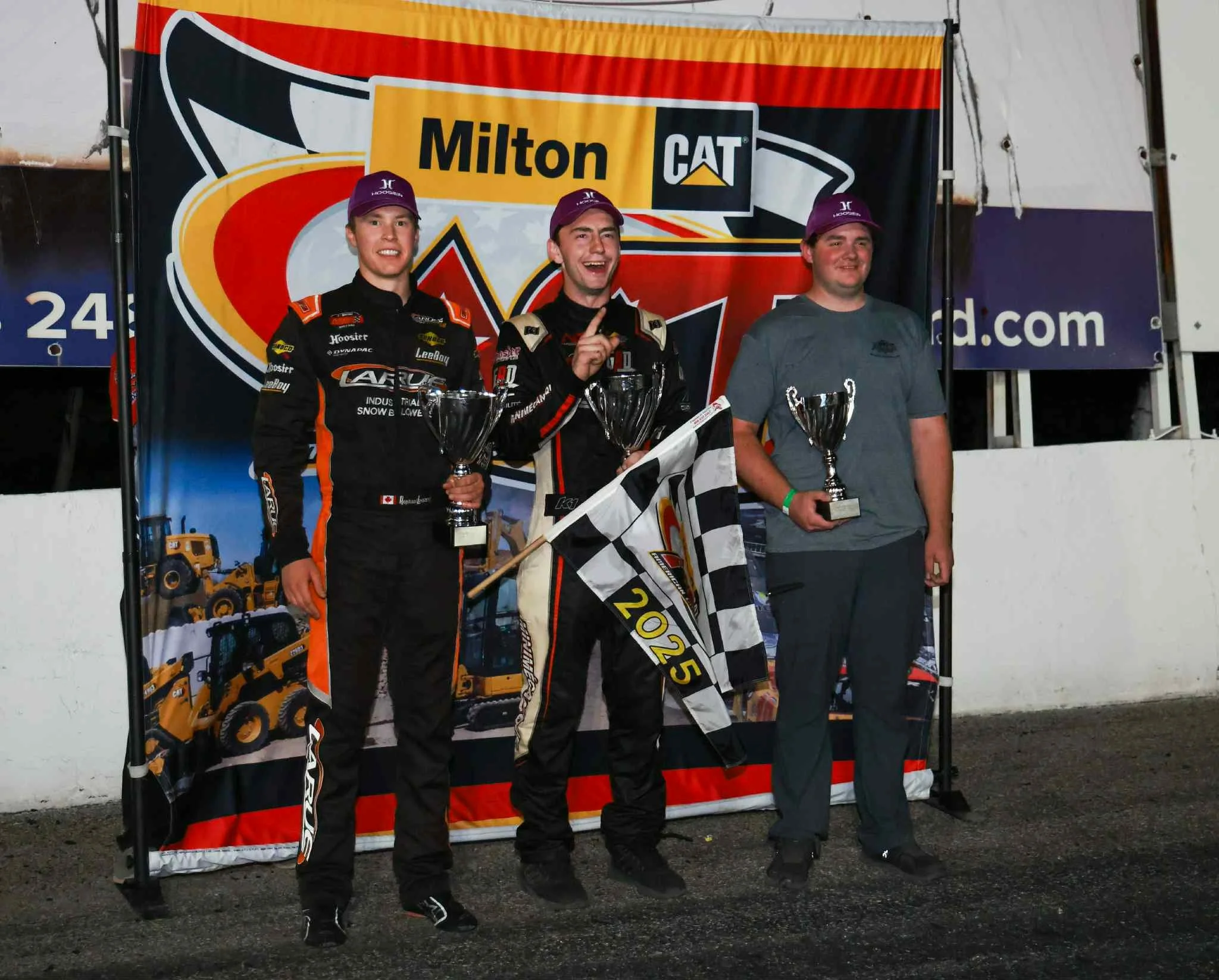 The verified photo finish saw Cote earn his first career Milton CAT American-Canadian Tour victory with the Beauceville driver instantly looking for the big Frechette Ford winner’s check stating “We’ve been trying to earn one of those [checks] for a very long time!” Point leader Raphael Lessard was officially declared second with Gabe Brown coming home third.
